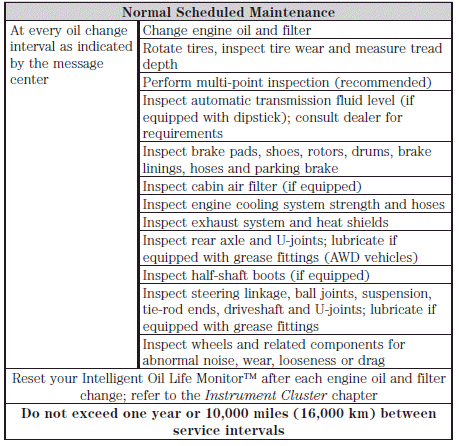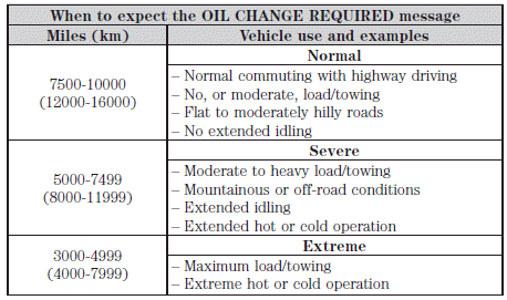 Your vehicle is equipped with an Intelligent Oil Life Monitor™ that determines when the engine oil should be changed based on how your vehicles is used. By using several important factors in its calculations, the monitor helps reduce the cost of owning your vehicle and reduce environmental waste at the same time. This means you won’t have to remember to change the oil on a mileage-based schedule; the vehicle lets you know when an oil change is due by displaying ENGINE OIL CHANGE DUE or OIL CHANGE REQUIRED in the message center. The following table is intended to provide examples of vehicle use and its impact on engine oil change intervals; it is provided as a guideline only.